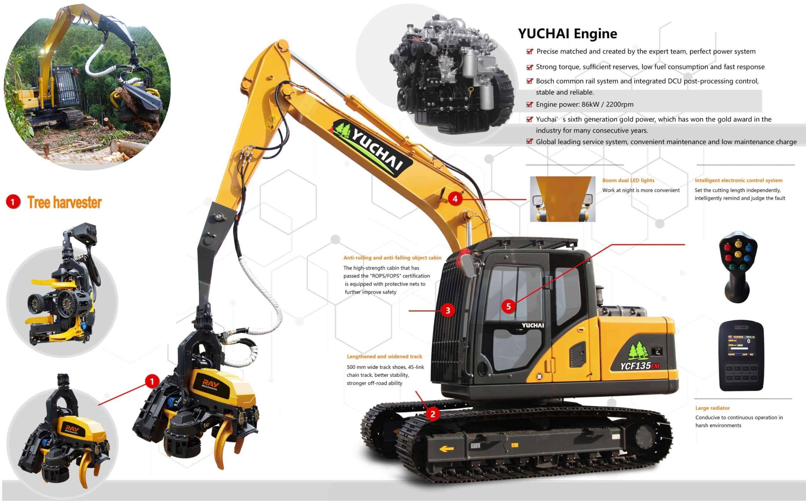 1. Raccoglitore di alberi: La testa di raccolta è adatta per alberi con diametro inferiore a 640 mm. Questa macchina offre una migliore stabilità, una resa più elevata, un'ampia gamma di applicazioni e un funzionamento semplice. Può essere equipaggiata con un escavatore da 8 a 28 tonnellate.