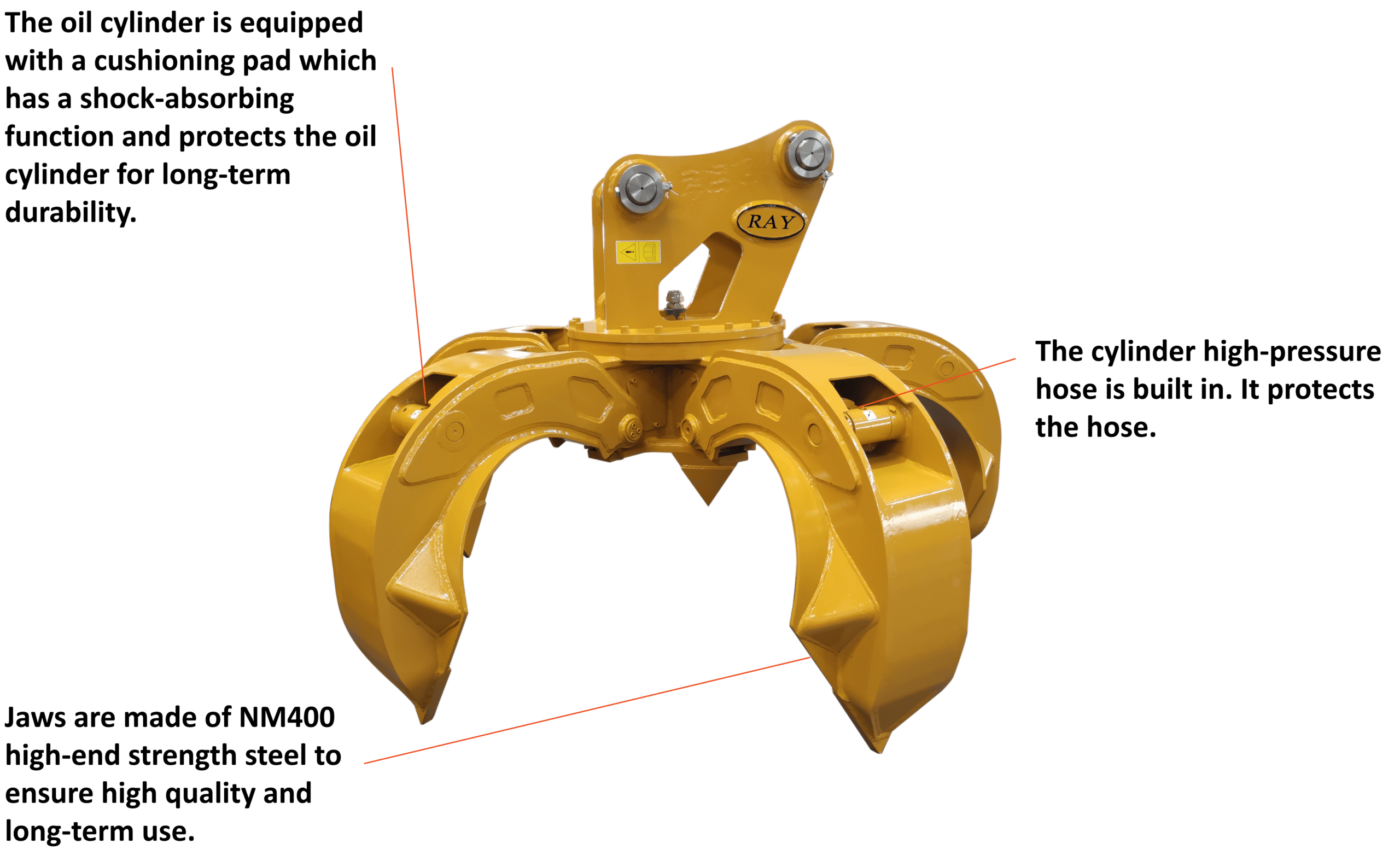 Грейфер типа «апельсиновая шелуха» может быть адаптирован к экскаваторам грузоподъемностью 5–35 тонн для погрузки, разгрузки, штабелирования, разборки штабелей, подачи и размещения различных видов стального лома. В основном используется для захвата лома и стального лома. RHGP-04 для экскаваторов грузоподъемностью 5–11 тонн, RHGP-06 для экскаваторов грузоподъемностью 12–18 тонн, RHGP-08 для экскаваторов грузоподъемностью 18–25 тонн, RHGP-10 для экскаваторов грузоподъемностью 26–35 тонн.